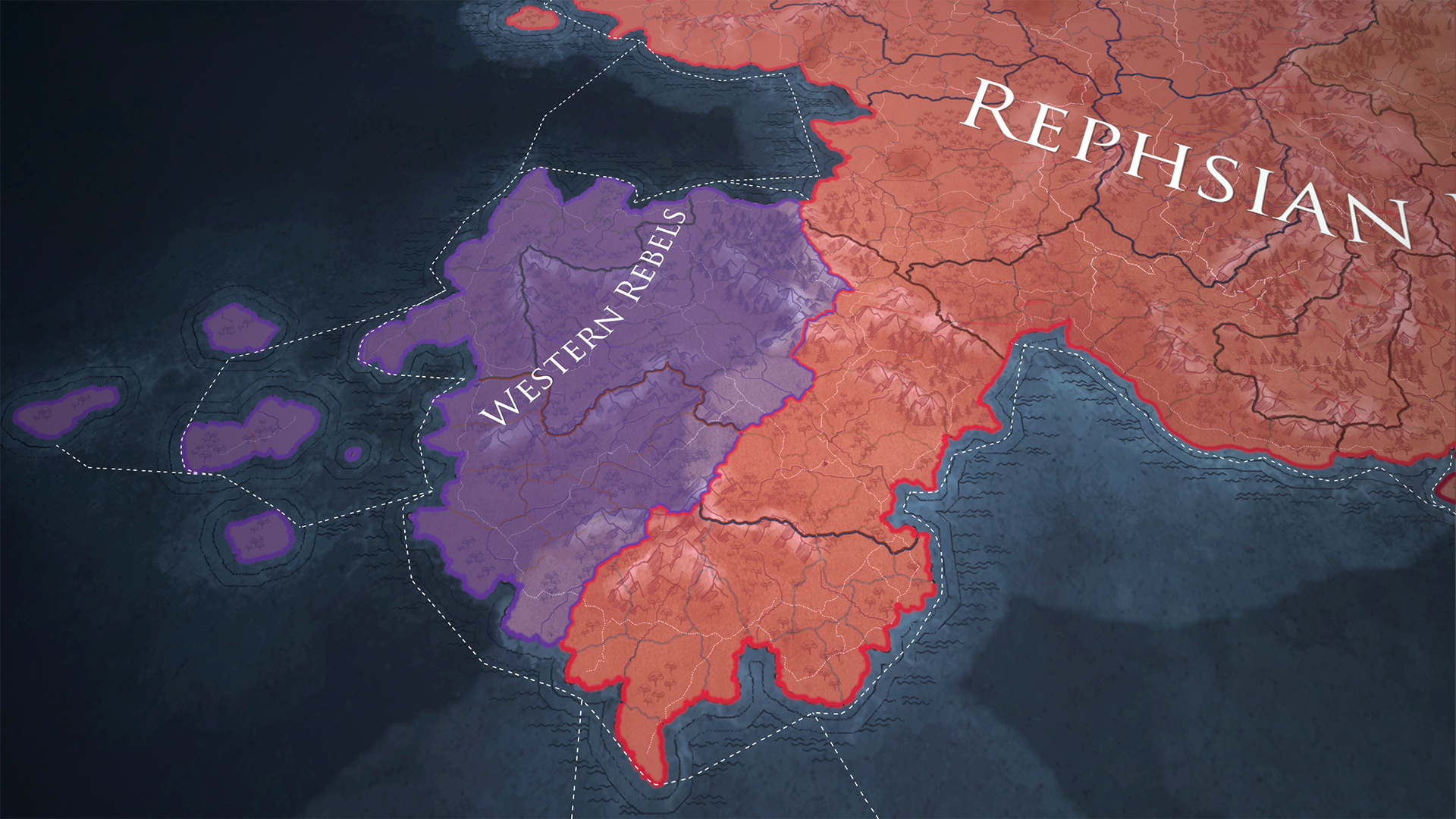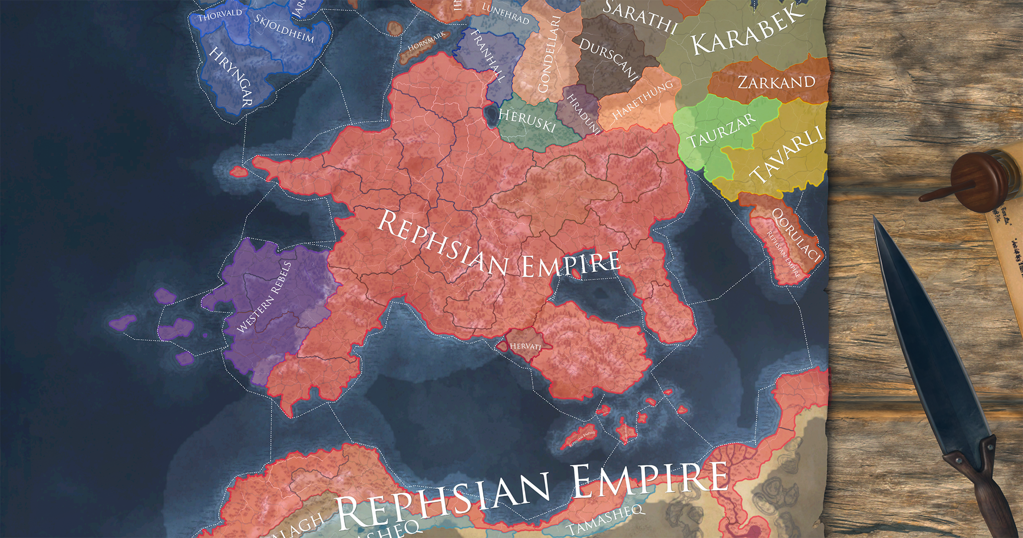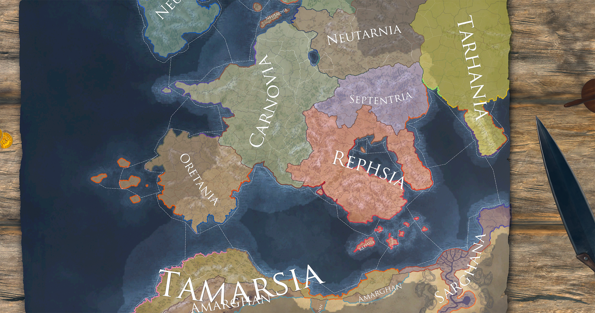 The world is split into these various Domains - high-level abstract regions. Of these there are ones that make up the Empire: Rephsia (the empire’s core), Septentria (the northeastern frontier), the peninsula of Oretania, Carnovia - a large and fertile, mostly flat land, and the mountainous, semi-arid Tamarsia and riverine Sarghania in the southern continent of Sattaria.