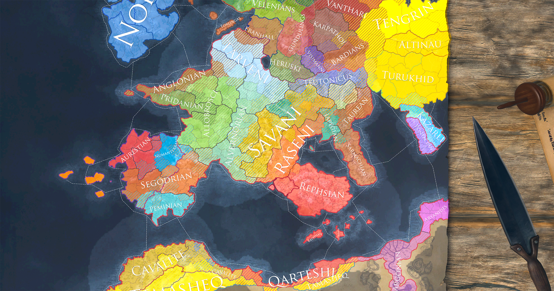 In Tamarsia the Angharati rule over the Rephsianised Cavalite people and are threatened by the Tamasheq desert-dwellers.