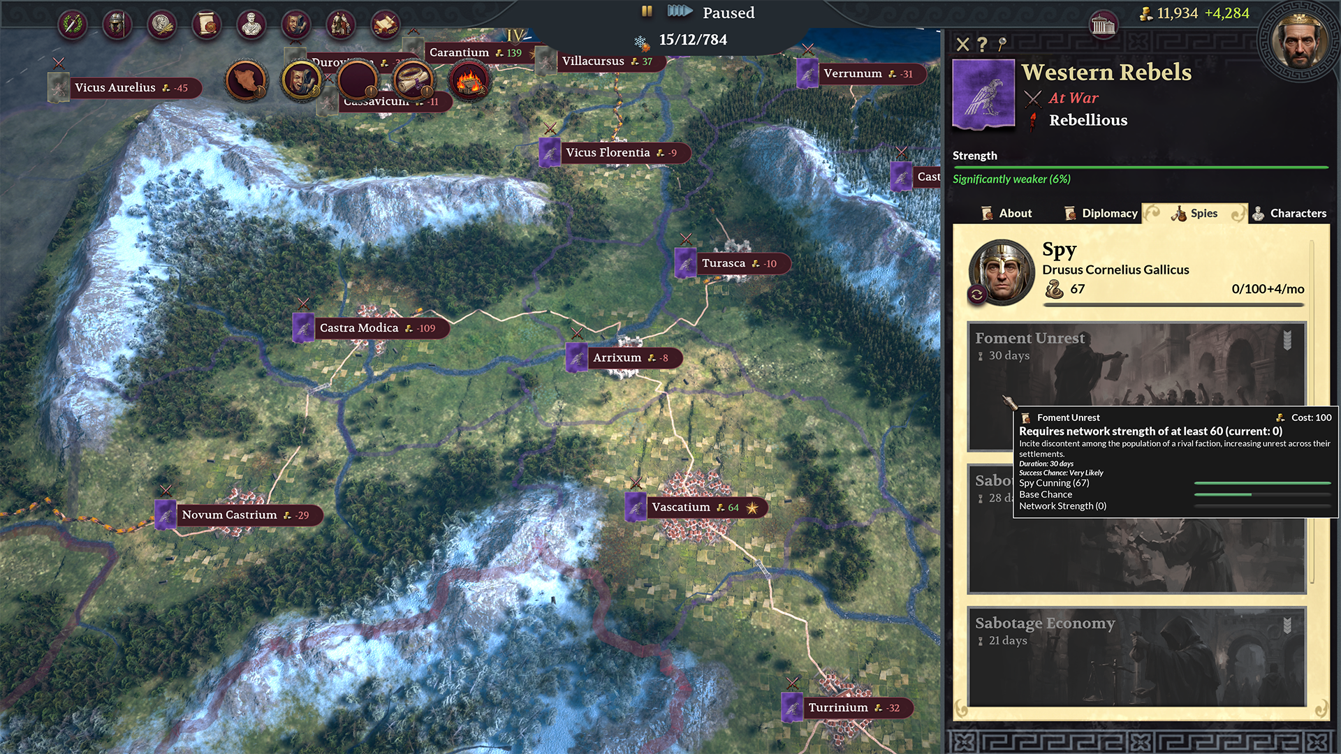 Beyond open diplomacy and outright war, there's a third option: espionage. You can assign a spy to any foreign faction, and over time they'll build up a spy network. Network strength grows based on your spy's Cunning stat, and the stronger the network, the more powerful operations you can attempt. By embedding the spy you’ll also get access to the faction’s fog of war, so you can see what army movements they’re planning in their territory.